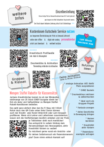 Die Waschzettel für jedes einzelne "Kreative Buch" beinhalten dann alle relevanten Infos rund um jedes Buch in kompakter Form zum kostenlosen selber Nutzen,